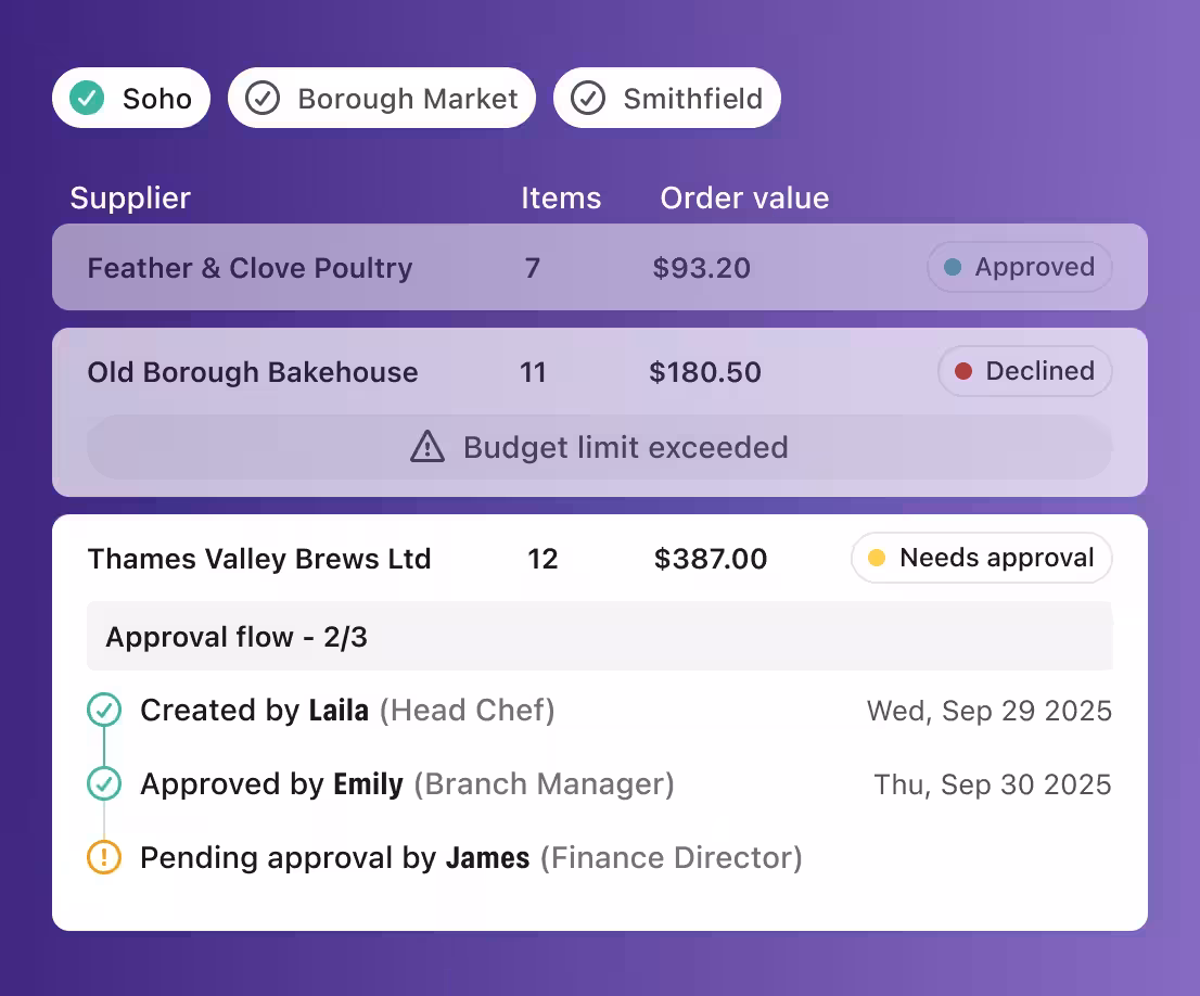 Raise requisitions, manage approvals, send Purchase Orders, order to central kitchen, and monitor price variances - on mobile or portal.