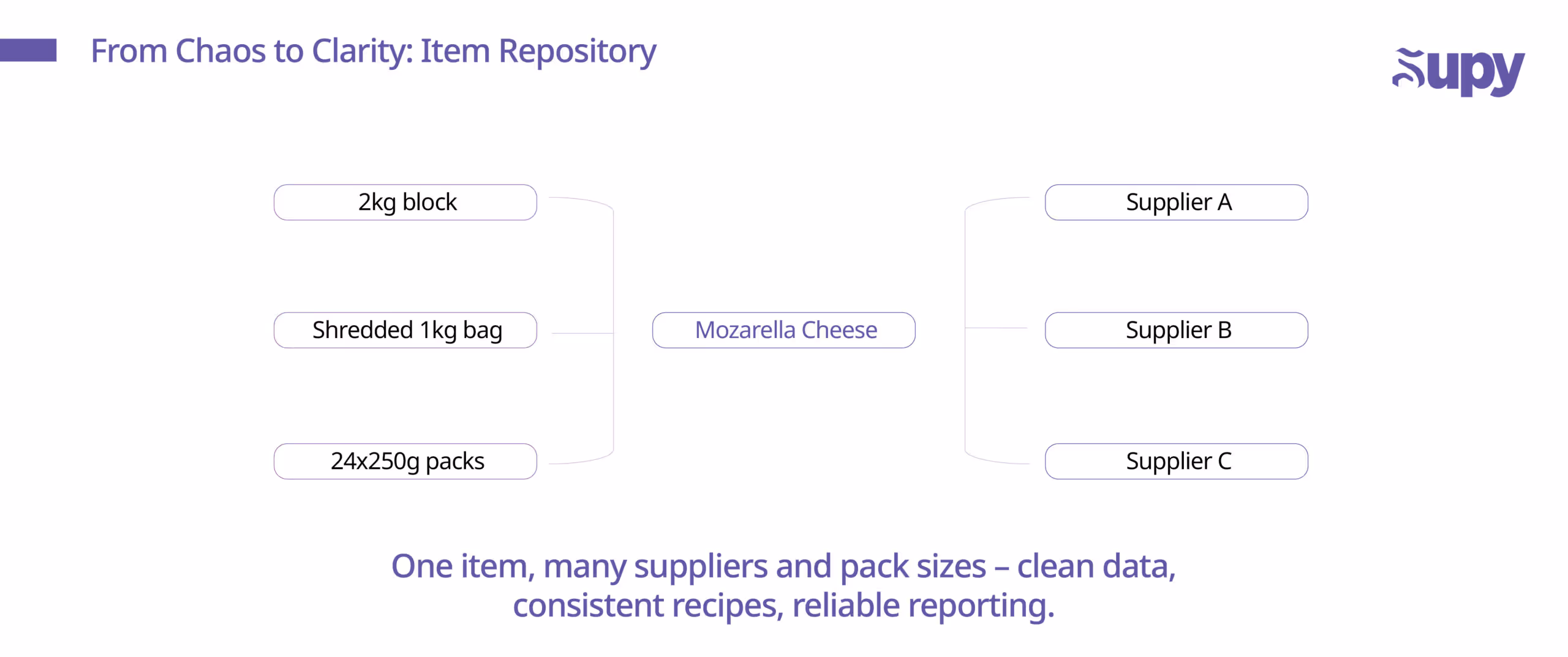 - إنشاء عناصر أساسية (بدون نسخ مكررة!) : في Supy، نستخدم مفهوم «العنصر الأساسي». وهذا يعني أن «الحليب الخالي من الدسم» هو عنصر واحد في النظام، حتى إذا قمت بشرائه من 5 موردين مختلفين بثلاثة أحجام مختلفة للعبوات «إذا كان لدي مايونيز من خمسة موردين، فلا أريد خمسة أنواع من المايونيز في نظامي... أريد ربط الخمسة جميعًا بعنصر واحد من المايونيز.». يمكن أن يحتوي كل عنصر أساسي على العديد من وحدات SKU الخاصة بالبائع المرتبطة به، وخيارات تغليف متعددة (مثل علبة مكونة من 24 زجاجة، وزجاجة واحدة بحجم 750 مل، وما إلى ذلك). بهذه الطريقة، عند إنشاء الوصفات أو تشغيل التقارير، فأنت تشير دائمًا إلى حليب خالي الدسم كفئة واحدة، ويتعامل النظام مع التحويل وراء الكواليس. لا مزيد من جداول بيانات فرانكنشتاين لتلخيص «موزاريلا (العلامة التجارية أ) +موزاريلا (العلامة التجارية ب)». وعندما يتغير المورد، ما عليك سوى ربط منتجه الجديد بمنتجك الحالي - دون أي اضطراب في وصفاتك أو بياناتك.