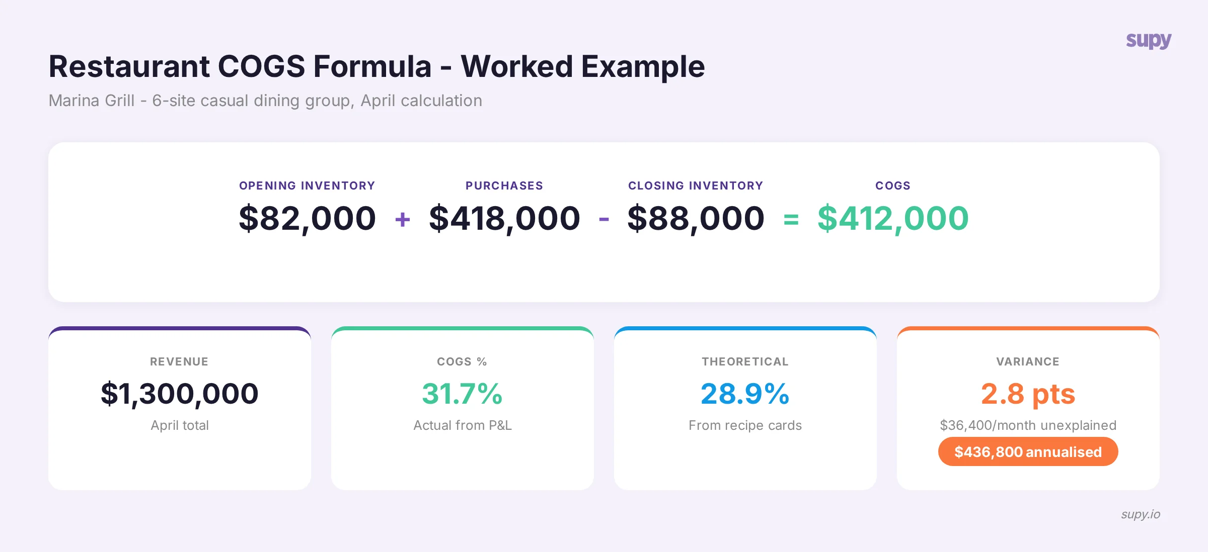 The COGS formula requires accurate opening and closing inventory values. A stocktake that is wrong by 3% in either direction can swing your COGS percentage by a full point - enough to mask or exaggerate a real trend.