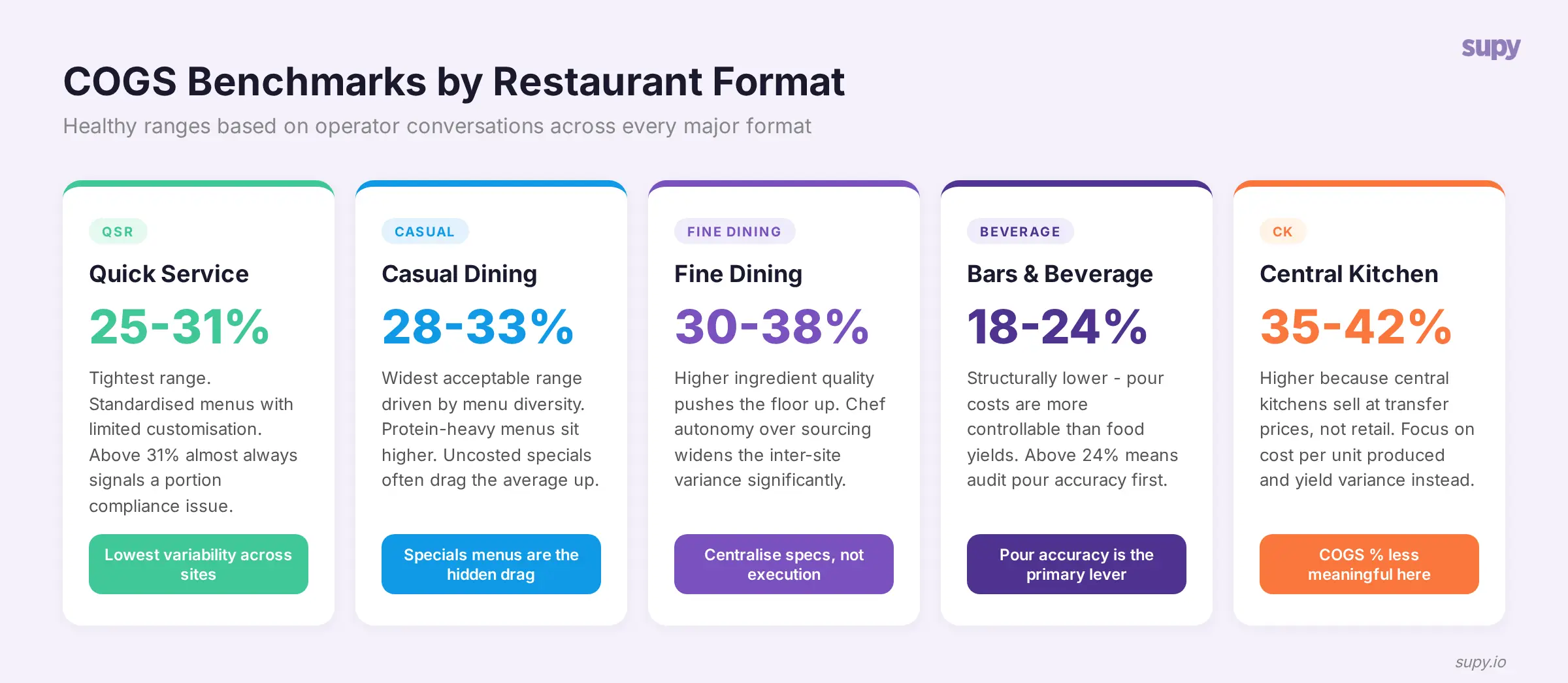 Fine dining: 30-38% COGS. Higher ingredient quality and more complex preparations push the floor up. The variance between sites within a fine-dining group tends to be wider than in QSR because chef autonomy over sourcing is greater. Multi-site fine-dining operators who centralise their purchasing specification - while leaving execution to the kitchen - consistently land at the lower end of this range.