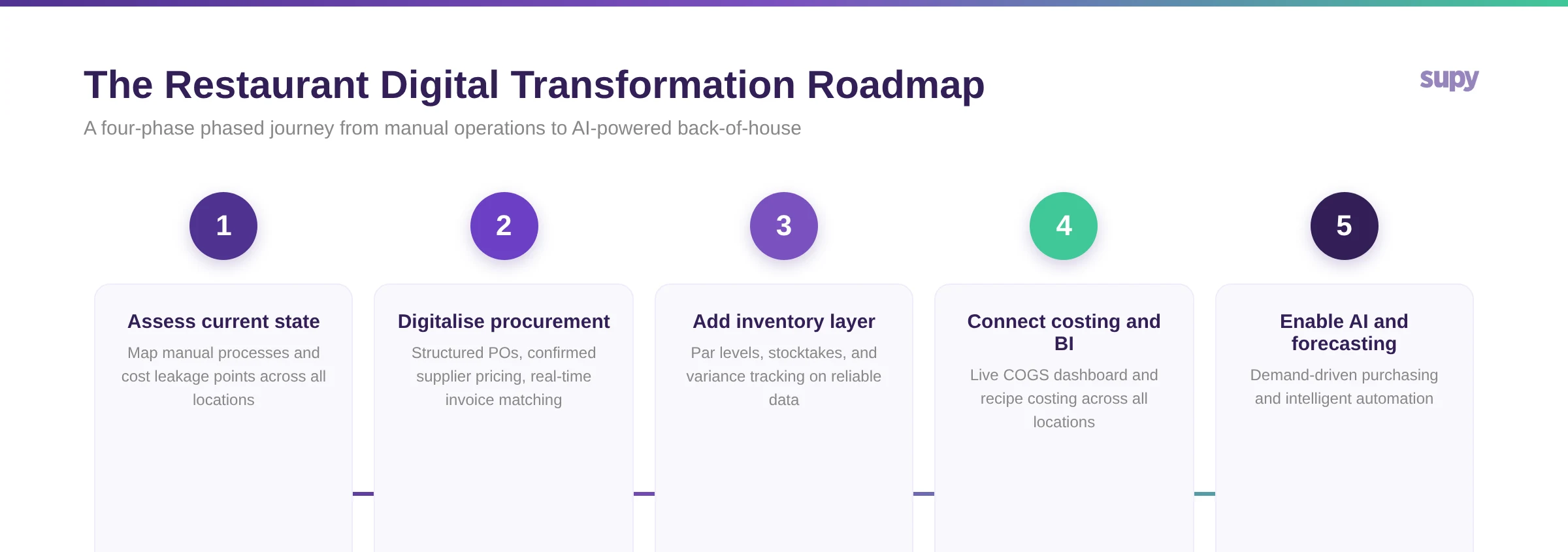 Supy is a back-of-house operations platform built for multi-unit restaurant groups. It connects procurement, inventory management, recipe costing, and business intelligence into a single operational layer - giving operators a live view of food cost and COGS across every location. Supy integrates with existing POS systems and is designed for operators at any stage of their digital transformation journey, from first-time procurement digitalisation through to AI-powered demand forecasting. See how Supy fits your digital transformation roadmap.