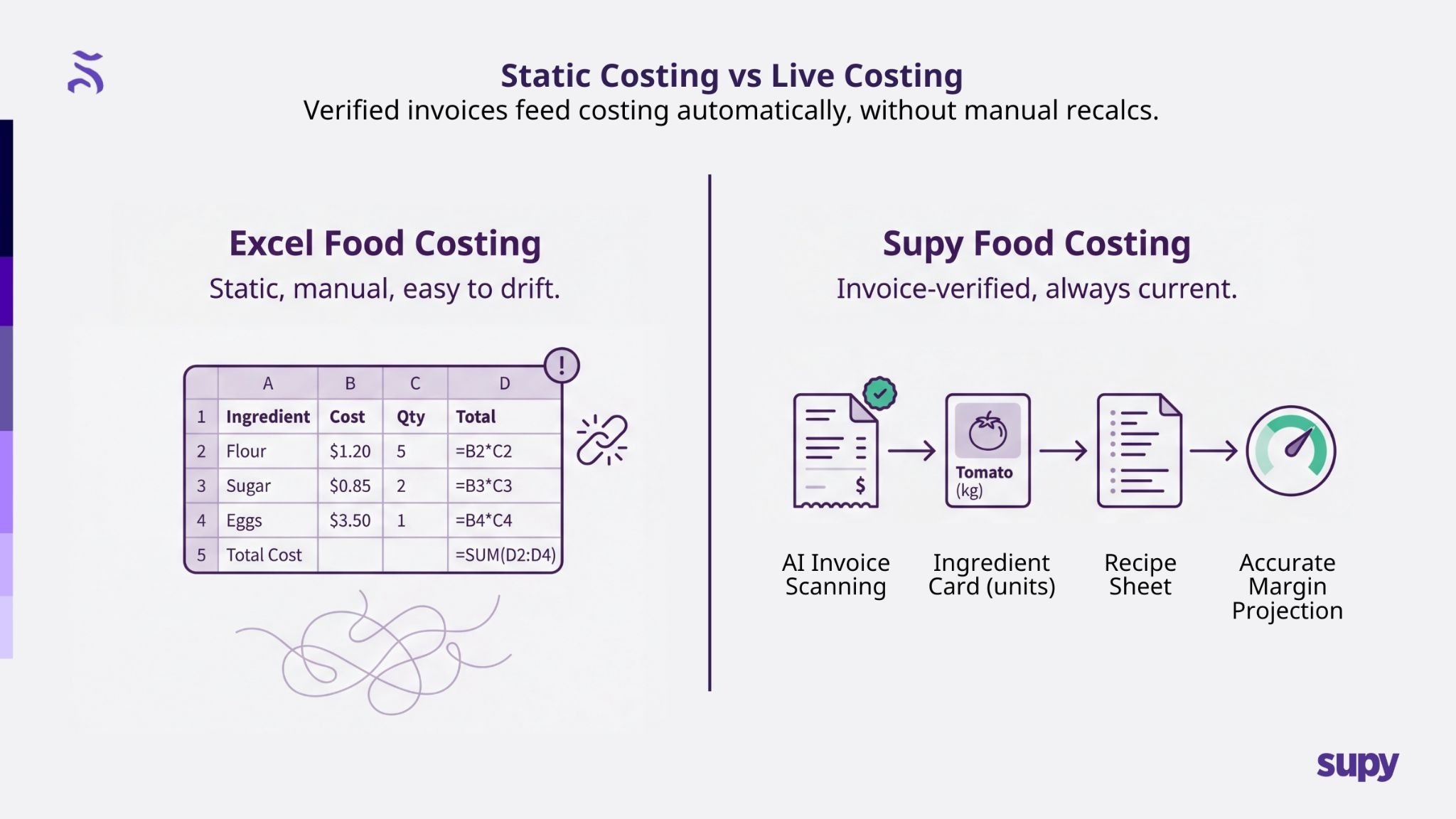 For operational food costing, yes. Supy keeps recipe costs tied to invoice-verified prices and inventory movement. Excel can still be useful for ad-hoc analysis or modelling, but it no longer has to be your source of truth.