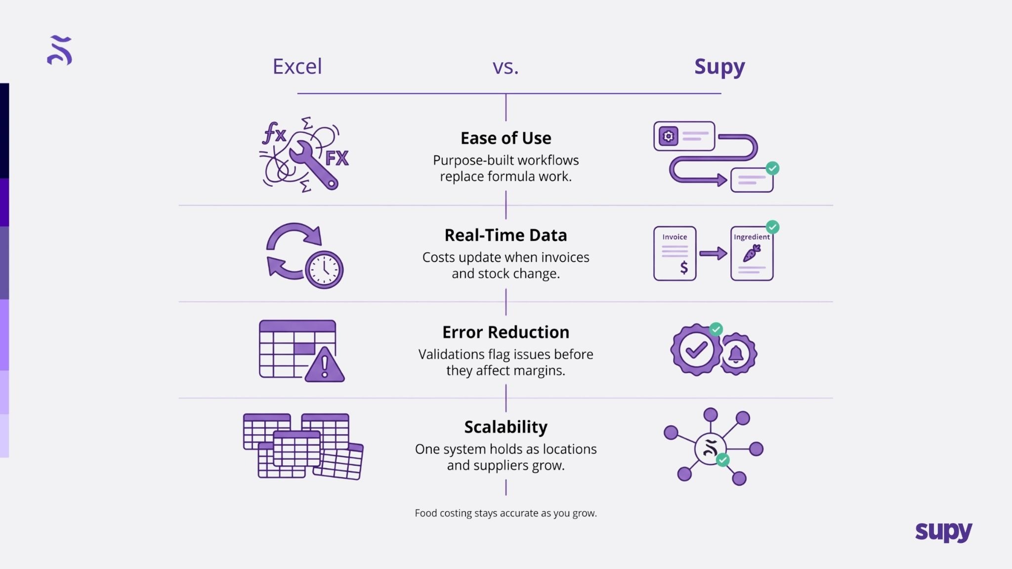 As we have seen, managing your food costs is crucial to your restaurant’s profitability. Here’s how Supy outshines Excel in four key areas: