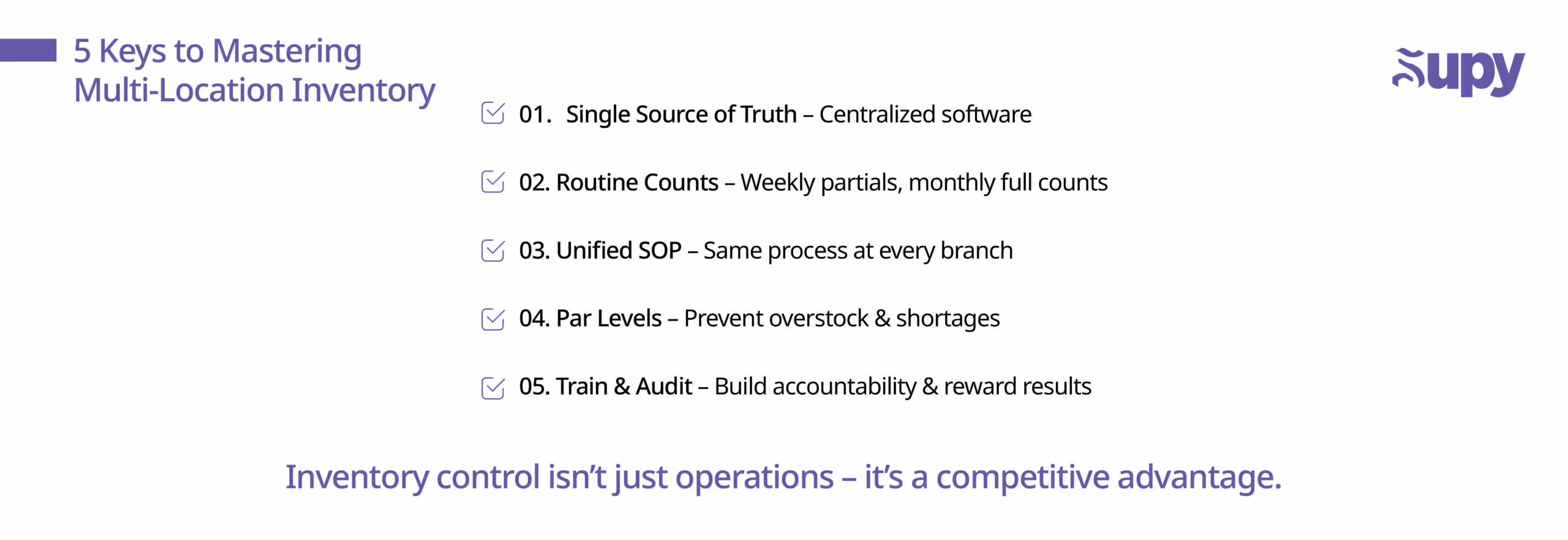 Managing inventory in a single restaurant is challenging enough, but doing it across dozens of locations can feel like a high-wire act. For operations directors overseeing 10, 20, or 50 branches, inventory mistakes get magnified – one missed stock count or ordering error in each outlet quickly adds up to significant waste and cost. In an era of rising food prices and razor-thin margins, getting a handle on multi-location inventory is no longer optional; it’s an essential strategic priority.Every extra bag of produce that spoils or each stockout of a menu item not only hurts profits, but also damages customer trust. A recent industry report found that 87% of restaurateurs saw food costs rise in 2024, with 82% expecting further increases in 2025. With average restaurant profit margins only around 3–5% 3 , there is zero room for error. The good news is that with the right systems and practices, even complex restaurant groups can keep inventory tightly controlled across all their locations.