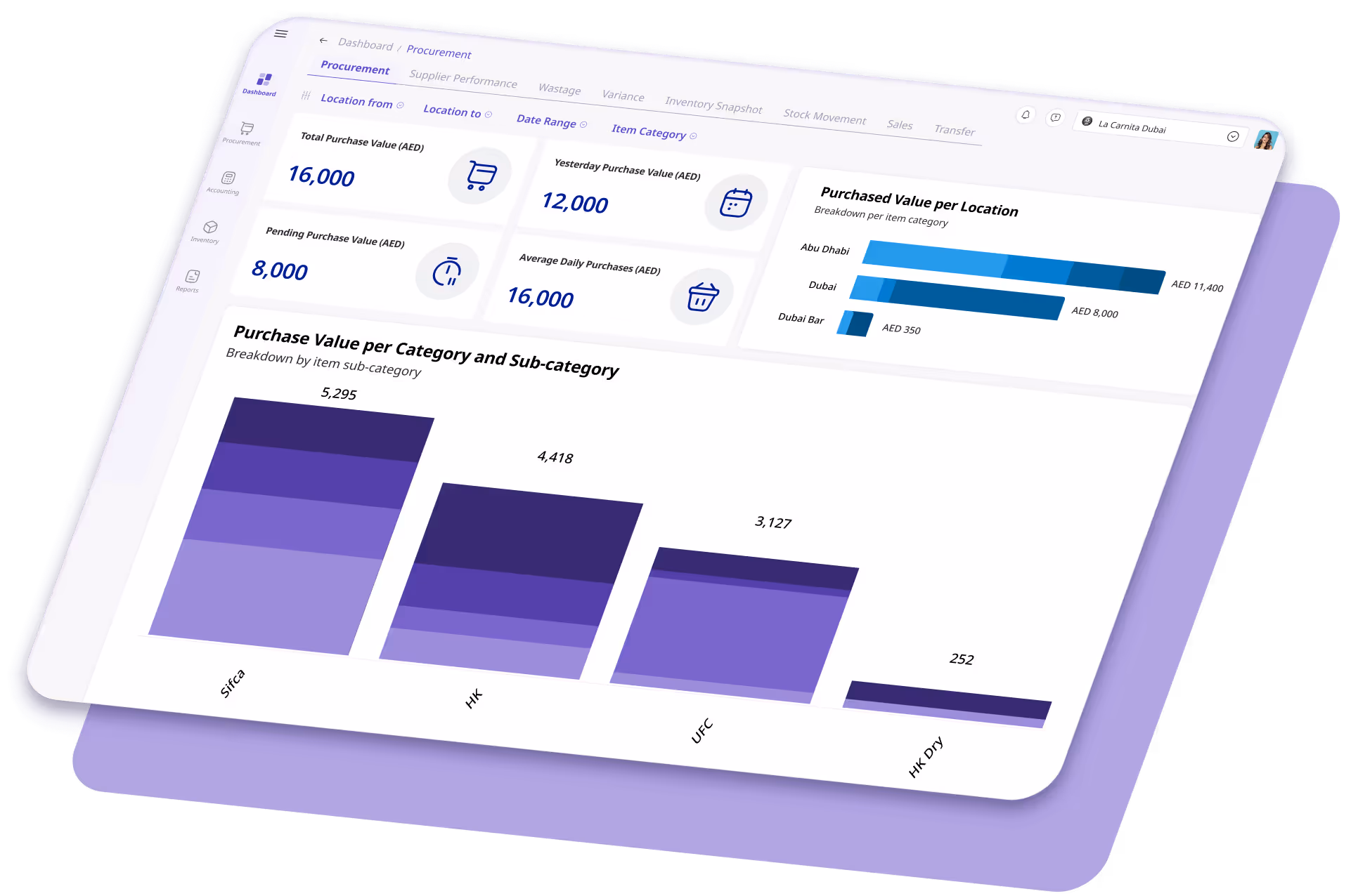 Supy’s interactive dashboards show COGS, variance, wastage, and profitability by brand, kitchen, or dish - helping you identify top performers, cost leaks, and growth opportunities.