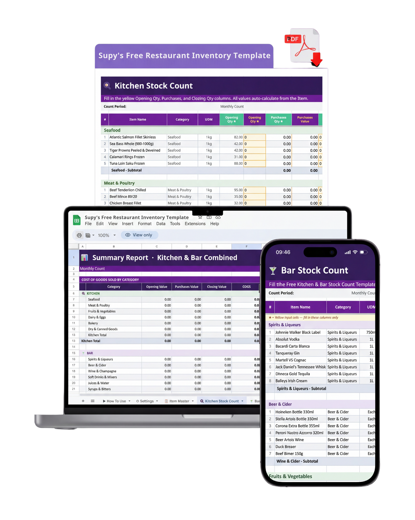 That changes today with Supy’s Free Restaurant Inventory Template, designed specifically for restaurant inventory management. It helps you: