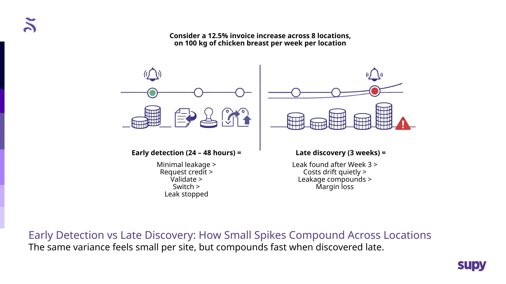 - Across Supy’s network in 2025–2026, over 80% of overcharges caught by AI were completely missed manually. That’s exactly the kind of leakage that doesn’t show up until month-end, when it’s too late to prevent.