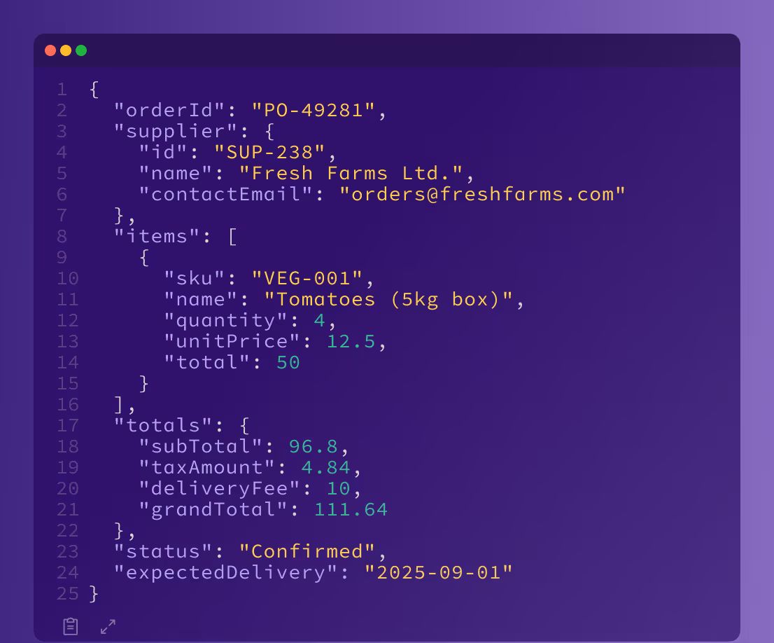 Supy’s Open API delivers structured, well-documented endpoints that integrate seamlessly into your data infrastructure. Whether you’re streaming into a central Data Lake, enriching existing datasets, or building advanced BI models, Supy gives your engineers and analysts the control and flexibility they need - without vendor lock-in.